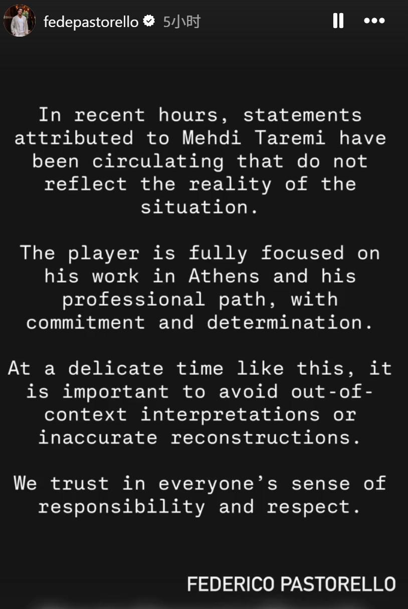 帕斯托雷洛表示:“近日流传的一些所谓塔雷米的言论,并不符合事实。球员目前完全专注于自己在雅典的工作与职业道路,保持承诺与决心。在这样一个敏感时期,避免断章取义或不准确的重构尤为重要。我们相信各方都能秉持责任感与尊重。”